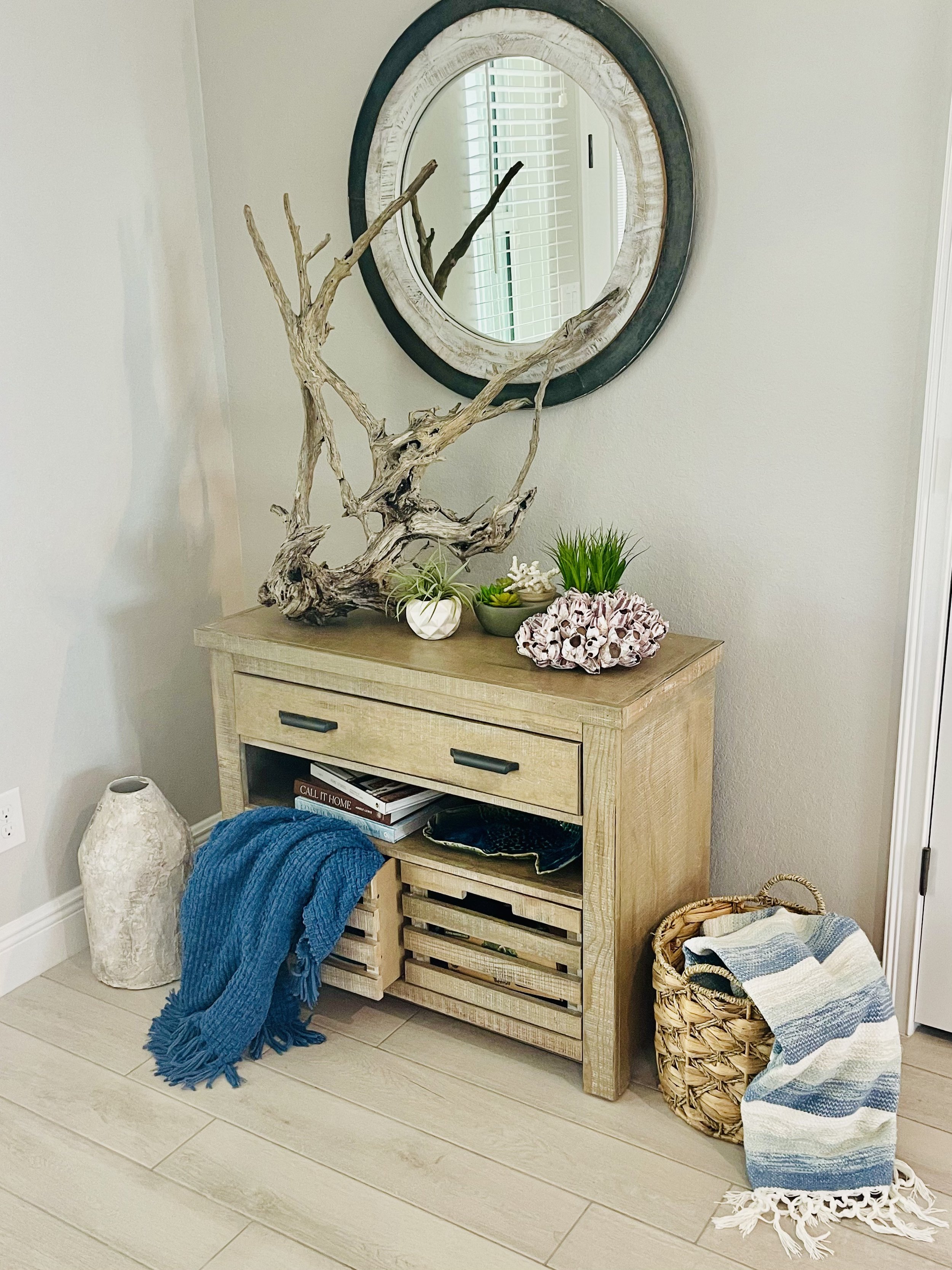 Today Dana owns and operates Dancing Palms Interiors; creating functional, purposeful spaces with character, charm and individuality. She specializes in a Coastal Cottage and Coastal Farmhouse design style; blending breezy beach tones of soft blues, sea foam greens and sandy neutrals with textures of driftwood, grasses, rattan, and naturally distressed wood furnishings to create an inviting space that feels like home.